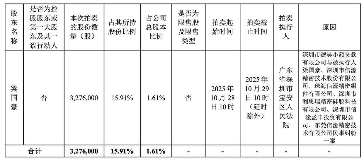 信濠光电9月29日再次公告,梁国豪持有的327.6万股公司股份将被司法拍卖,拍卖日期为2025年10月28日10时至2025年10月29日10时止(延时除外)。